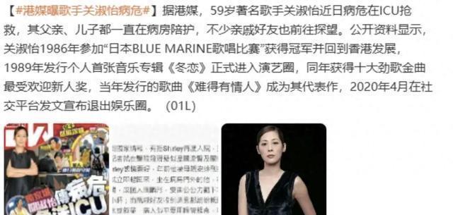 Hello,baby! 这两天,传岁的香港著名女歌手关淑怡在ICU病危的消息。让喜欢她的乐迷感到非常揪心。